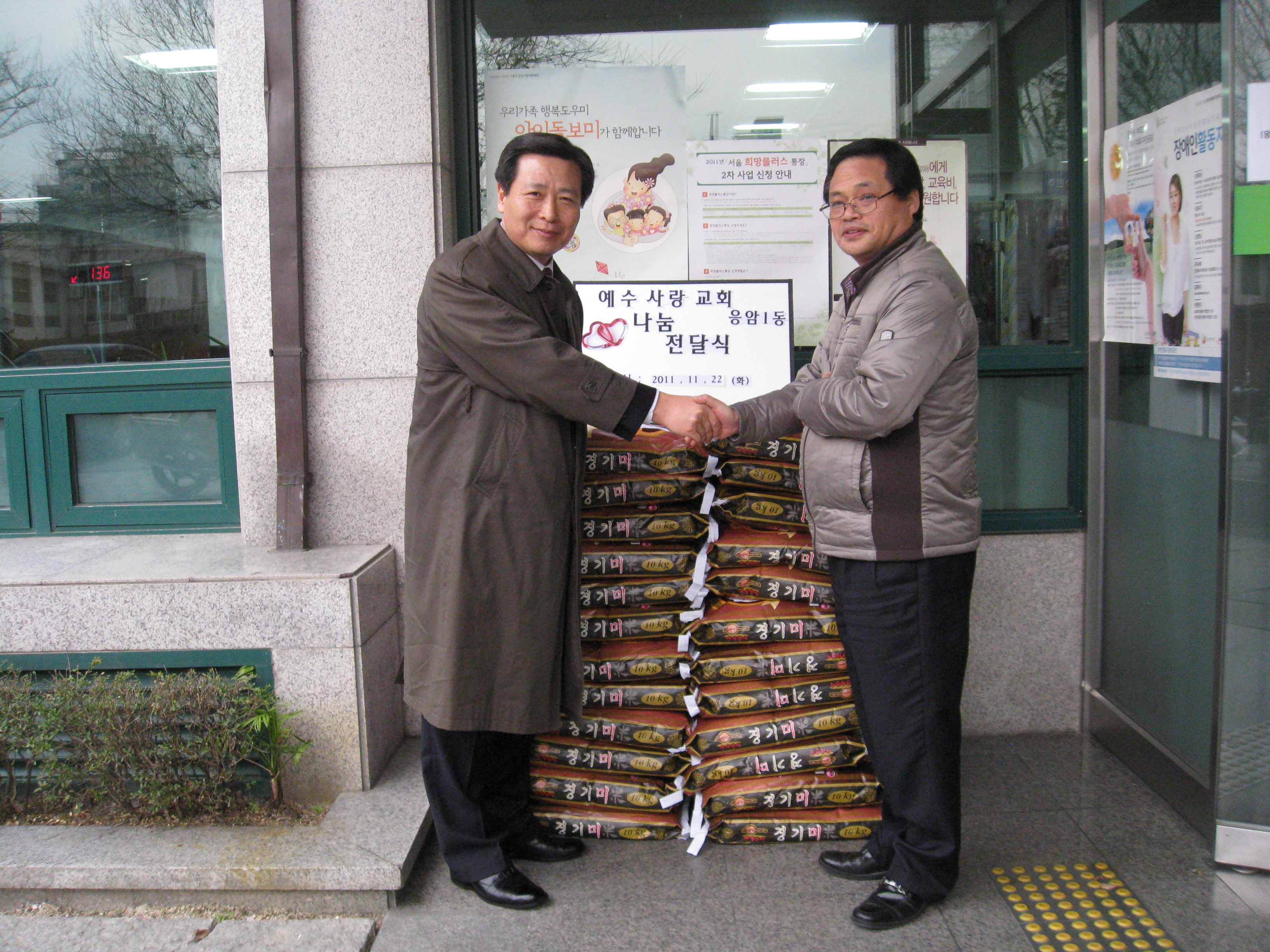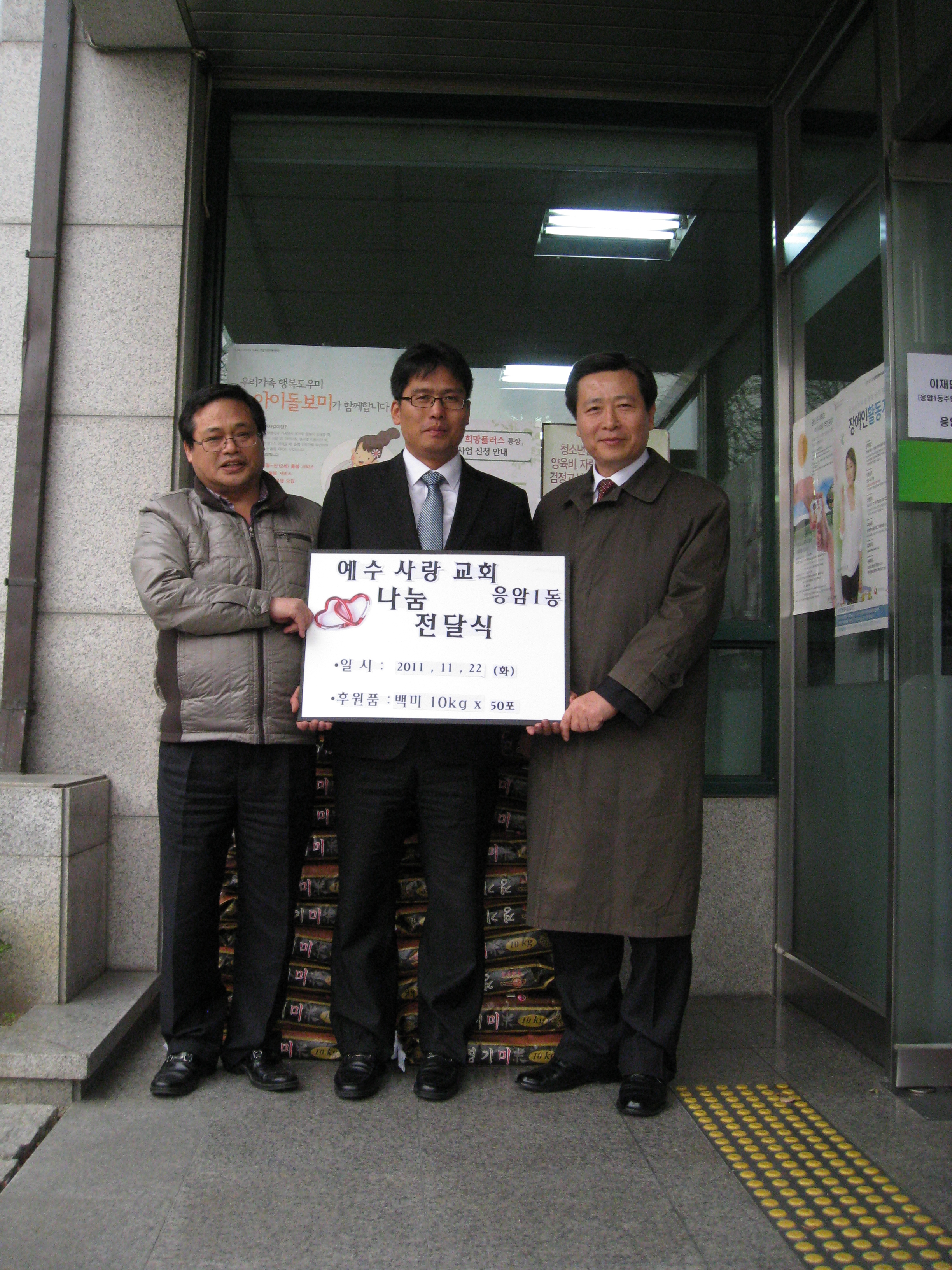응암동 독거노인 쌀전달식 본문 응암동 독거노인 쌀전달식응암동 독거노인 쌀전달식 추수감사기념으로 독거노인들을 위해 쌀 500kg을 응암1동 주민센터에 전달했습니다. 관리자 조회 7,263회 2011-11-24 15:05 목록 댓글목록 이전글 2011 예수사랑 추수감사예배 11.11.28 다음글 설립 2주년 기념성회 11.11.16